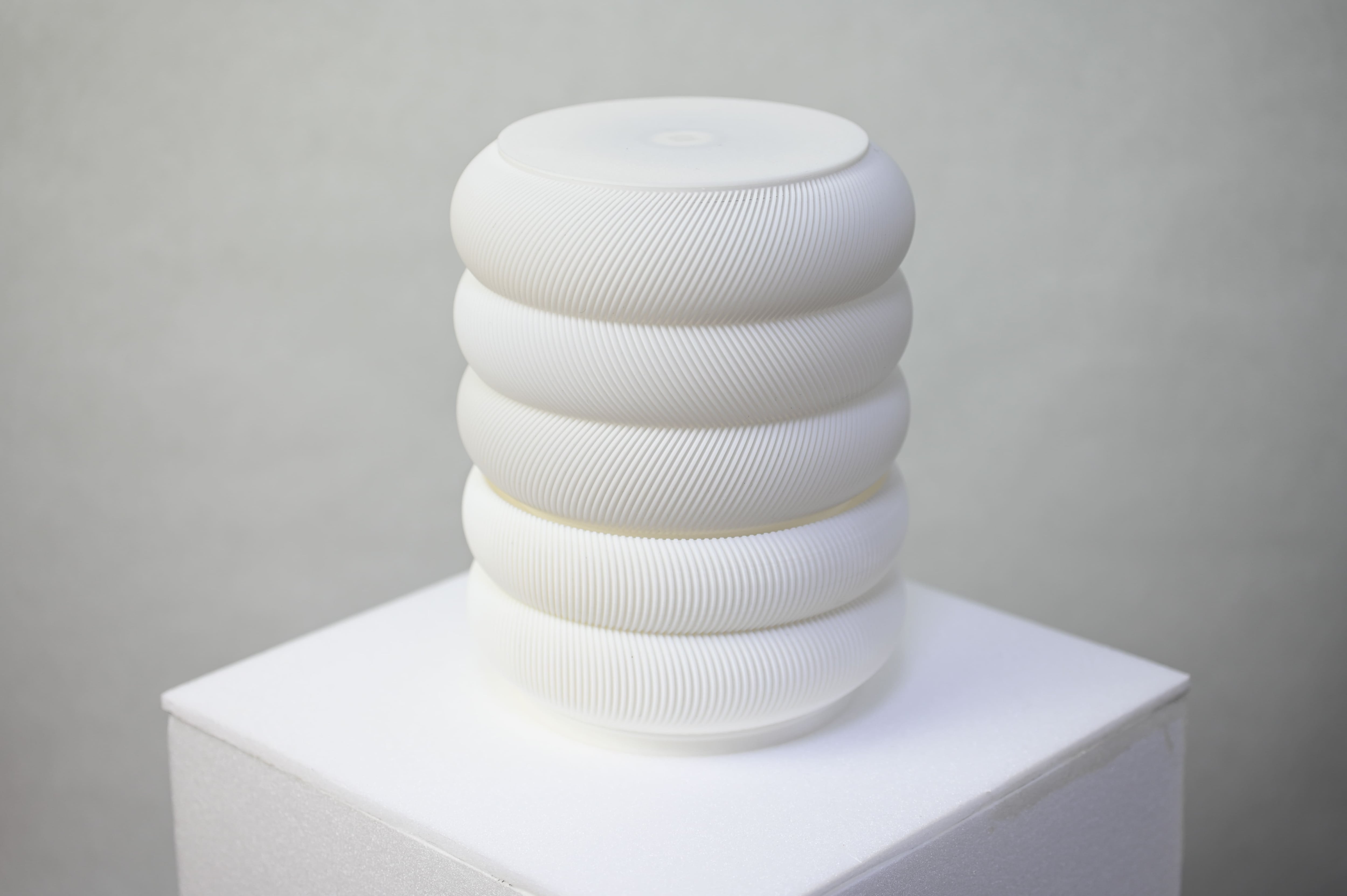 リング状のフォルムが幾重にも重なり、まるで光が流れるような美しいシルエットを生み出します。デジタルで設計されたこの形状は、3Dプリンターだからこそ実現できる独特の存在感を放ちます。