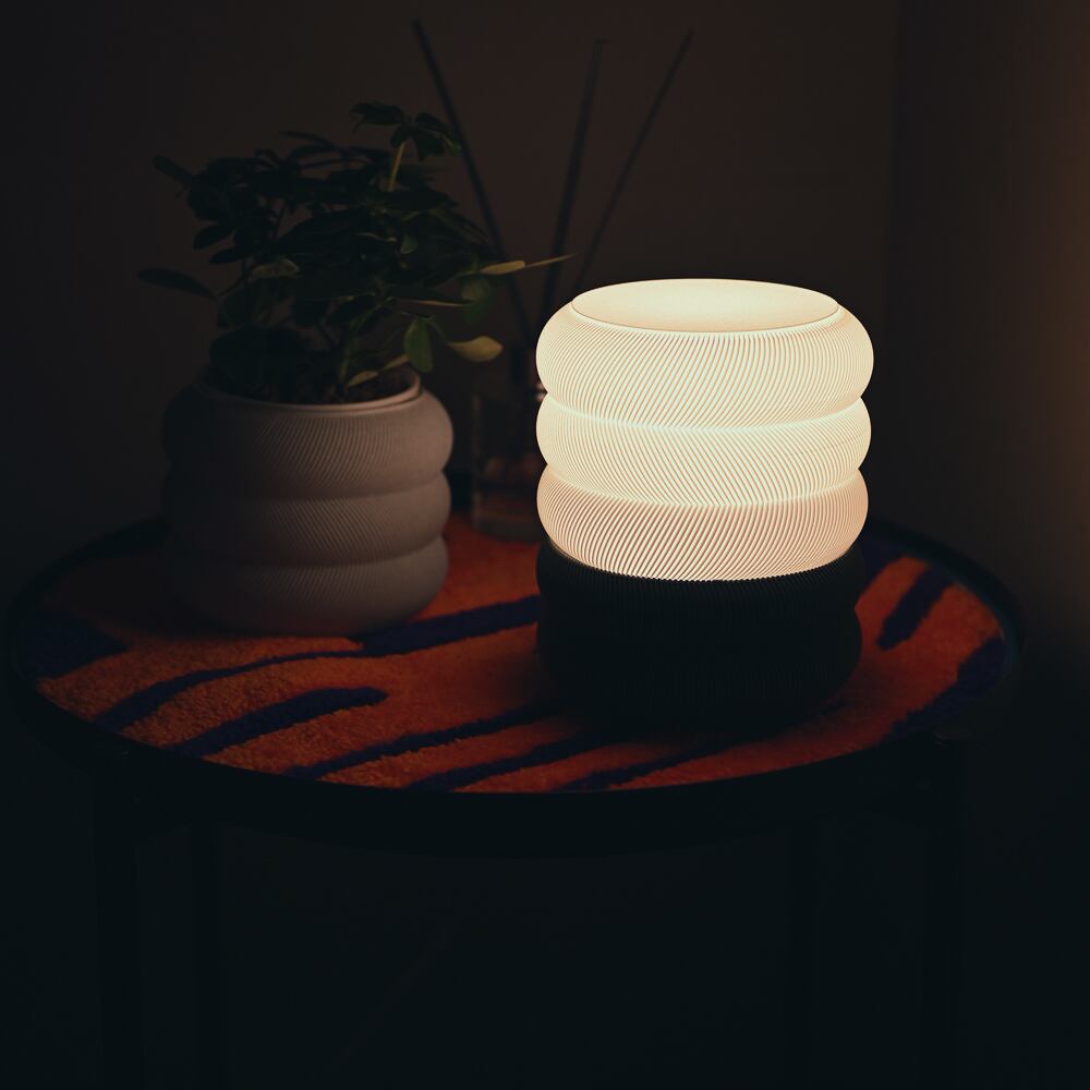 リング状のフォルムが幾重にも重なり、まるで光が流れるような美しいシルエットを生み出します。デジタルで設計されたこの形状は、3Dプリンターだからこそ実現できる独特の存在感を放ちます。