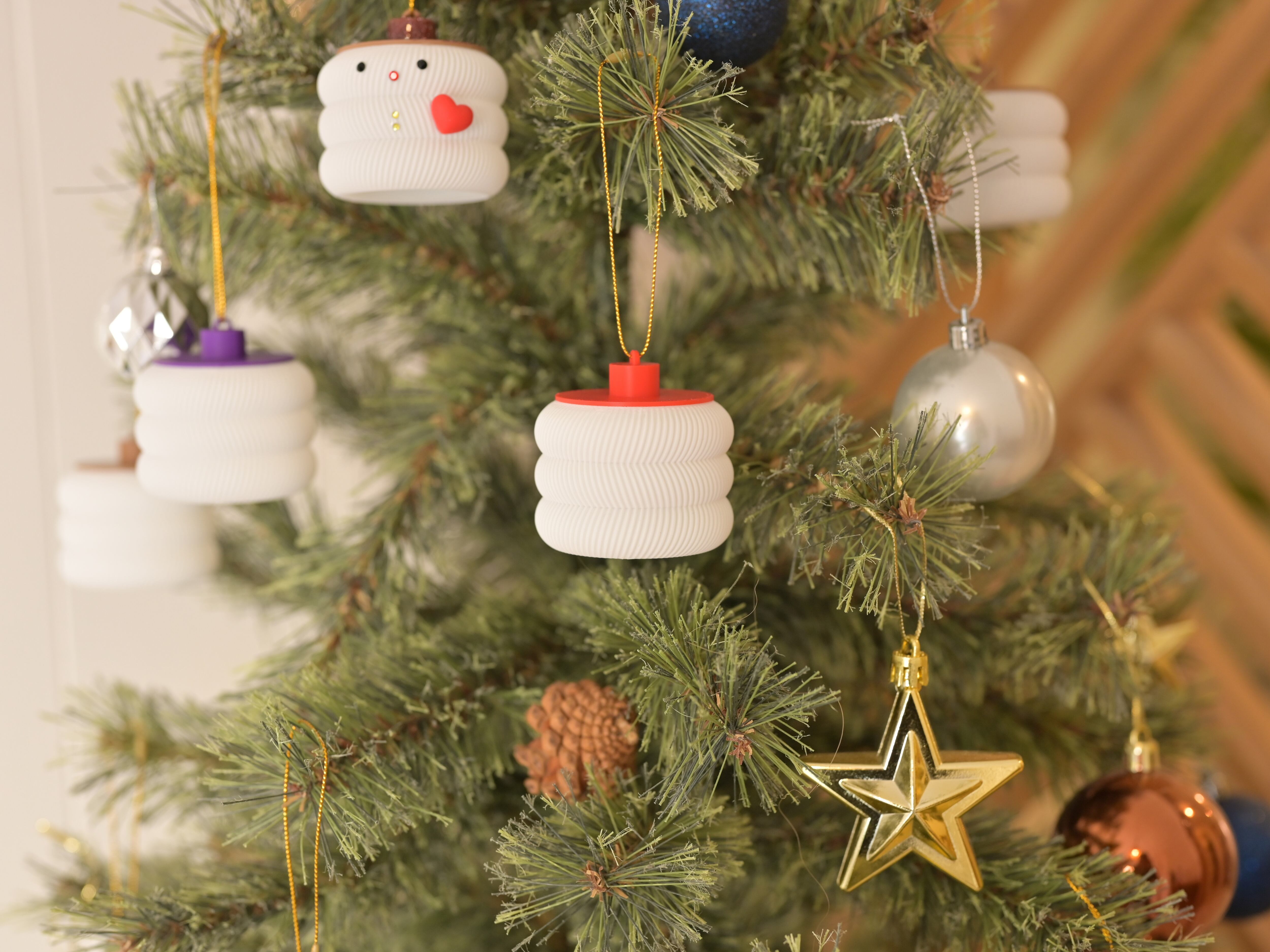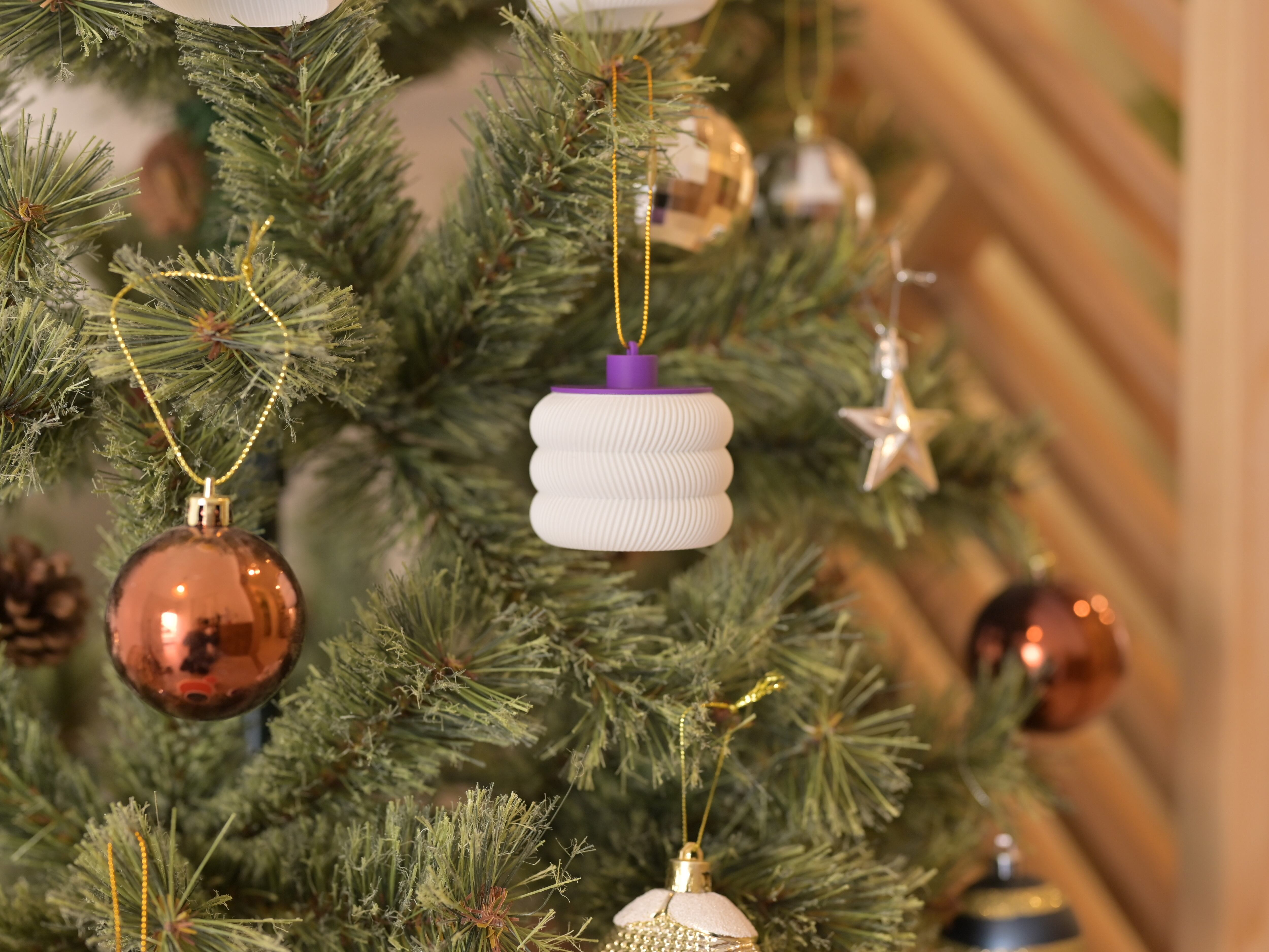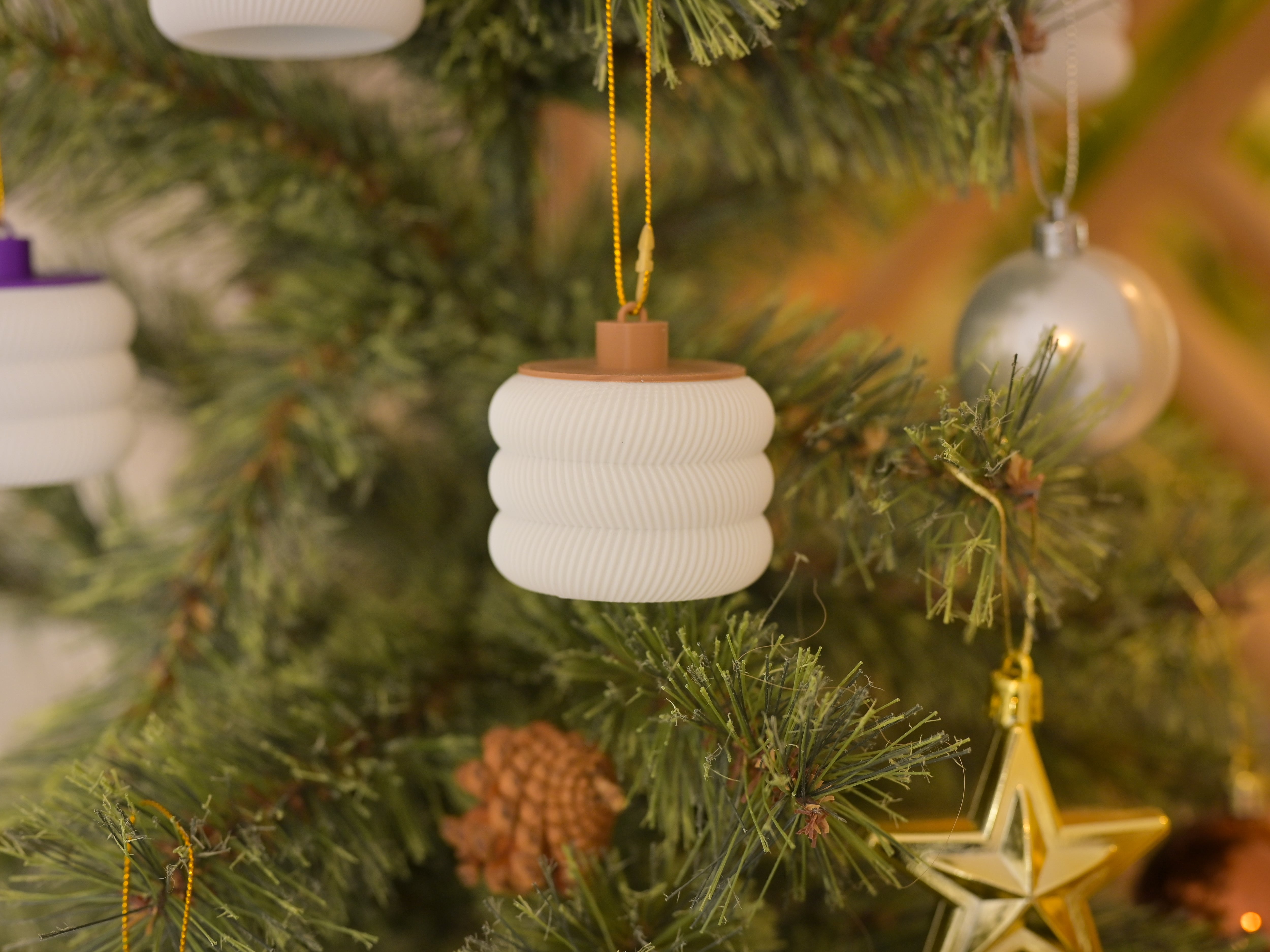 ころんとしたランプ型のシルエットと、細かなリブ模様が特徴の3Dプリント製クリスマスオーナメントです。